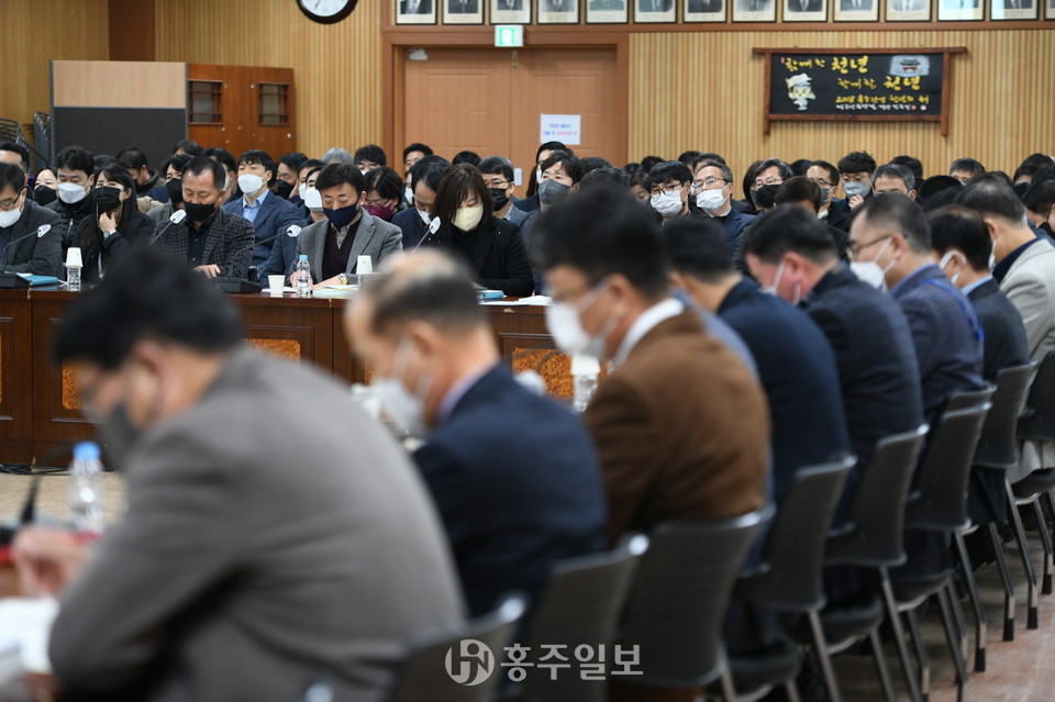 이용록 홍성군수와 정한율 부군수를 비롯한 각 부서장, 담당자 등 150여 명이 참석한 이날 보고회는 주요 현안 사업에 대해 이용록 군수가 부서장, 팀장에게 사업 추진경과와 문제점, 해결방안 등에 대해 질의하고 답하는 토의 형식으로 진행됐다.