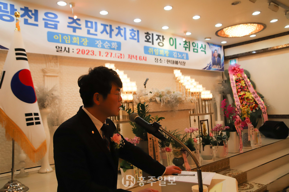 광천읍주민자치회(이임회장 장순화·취임회장 김노성)는 지난 27일 저녁 6시 광천 현대예식장 2층에서 회장 이·취임식을 개최했다.