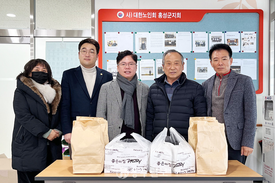 (사)충청사람과문화(이사장 정윤)는 지난 28일 대한노인회 홍성군지회(지회장 조화원)에 행복빵을 전달했다.<사진>