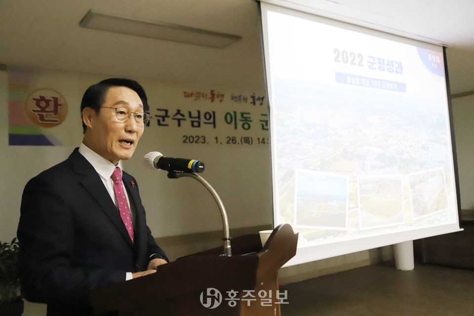 사진은 지난달 26일 갈산면 이동 군정 설명회에서 이용록 홍성군수가 주민들에게 2022년 군정 성과를 보고하고 있는 모습.
