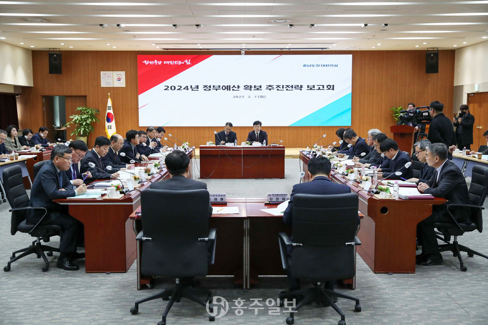 충남도는 7일 도청 대회의실에서 김태흠 지사와 실국원장 등 50여 명이 참석한 가운데 정부예산 확보 추진 전략 보고회를 개최했다.<사진>