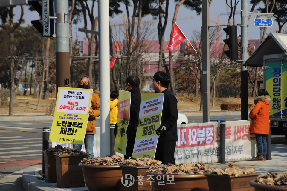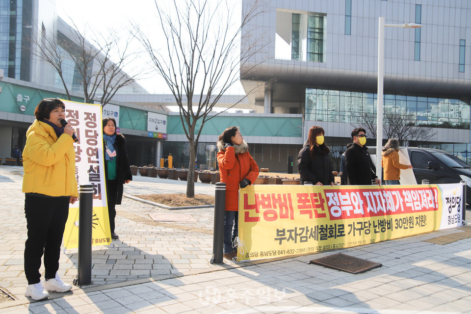정의당 충남도당(위원장 한정애)이 지난 8일 오전 11시 30분 충남도청 앞에서 정당 연설회를 진행했다. 정의당 정당연설회에서는 노란봉투법 제정 문제와 난방비 문제에 대해 자신들의 주장을 펼쳤다.<사진>