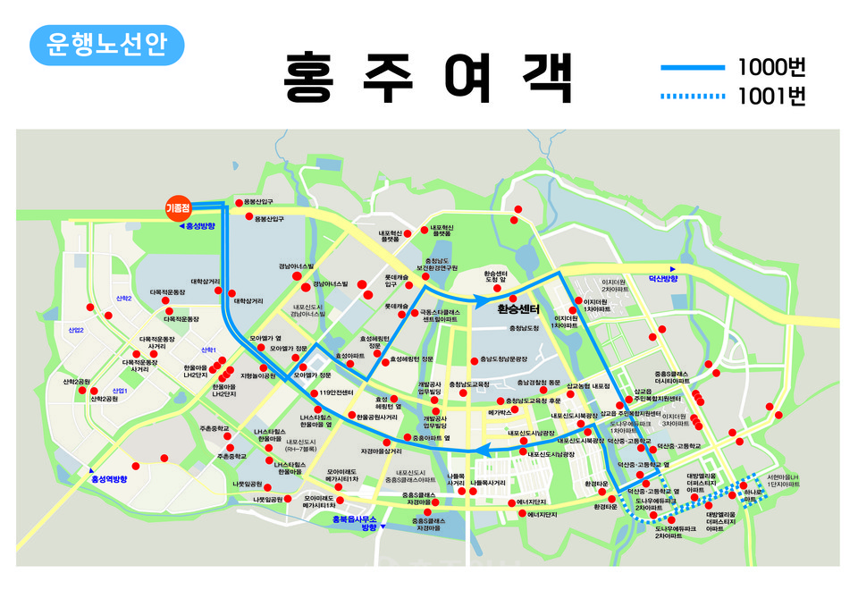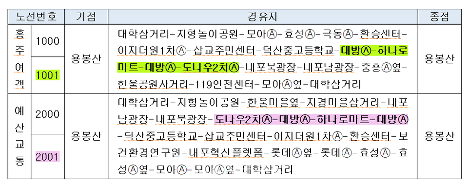 오전 7시∼8시 30분, 오후 5시∼8시 출퇴근 및 등하교 시간대에 운행하는 1000번과 2000번은 하루 5회씩, 오전 9시∼오후 4시 30분 사이 낮 시간대 운행하는 1001번과 2001번은 6회씩 운행한다. 무료 환승은 1시간 이내 1회 적용되며, 5월부터 무료 환승 횟수를 2회까지 확대할 예정이다.