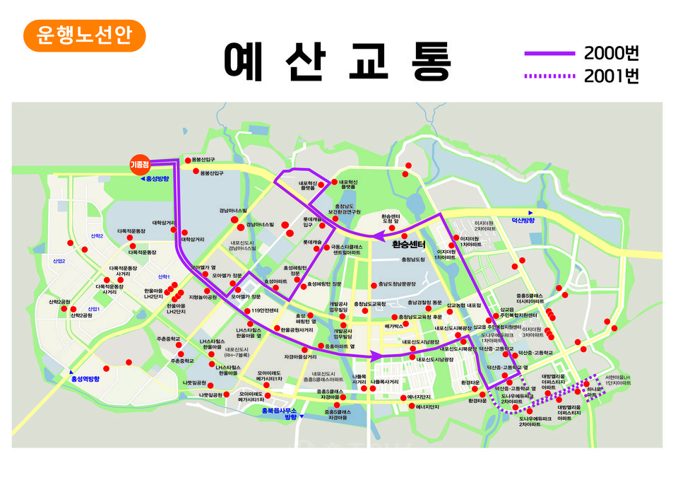 버스 노선은 용봉산을 기점·종점으로 1000번·1001번(홍주여객)이 시계 방향, 2000번·2001번(예산교통)이 반시계 방향으로 운행하며, 운행 소요 시간은 45분이다.
