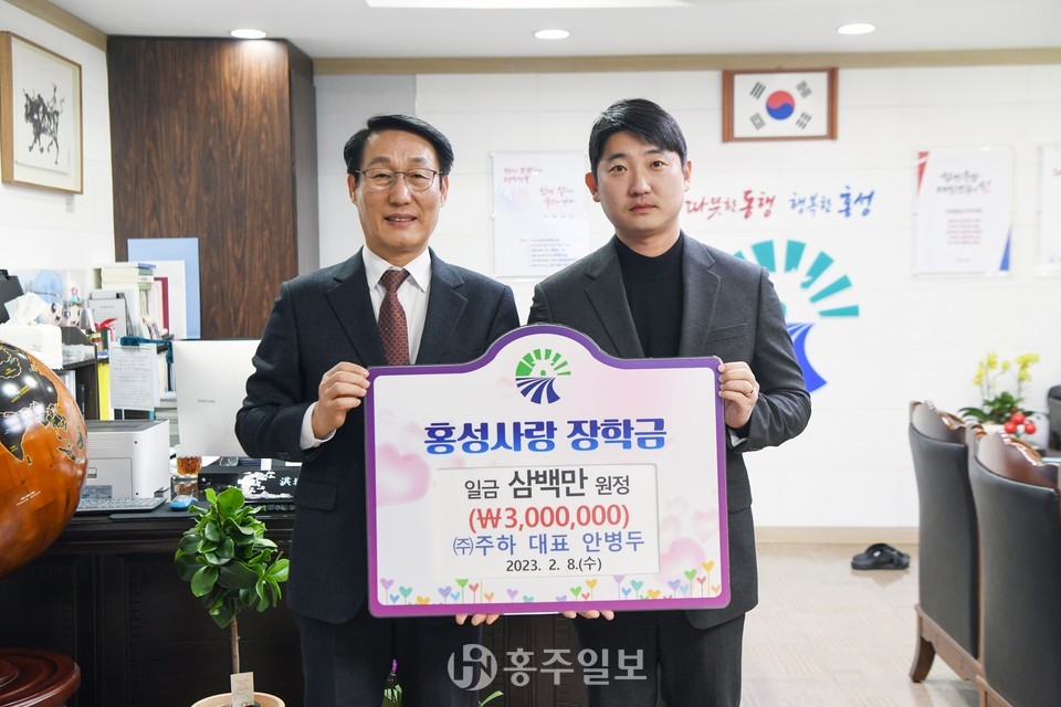 안병두 주식회사 주하, 진광토건 대표가 지난 8일 지역의 우수 인재 양성에 보태달라며 (재)홍성사랑장학회 이사장인 이용록 홍성군수를 만나 장학기금으로 300만 원을 기탁했다.