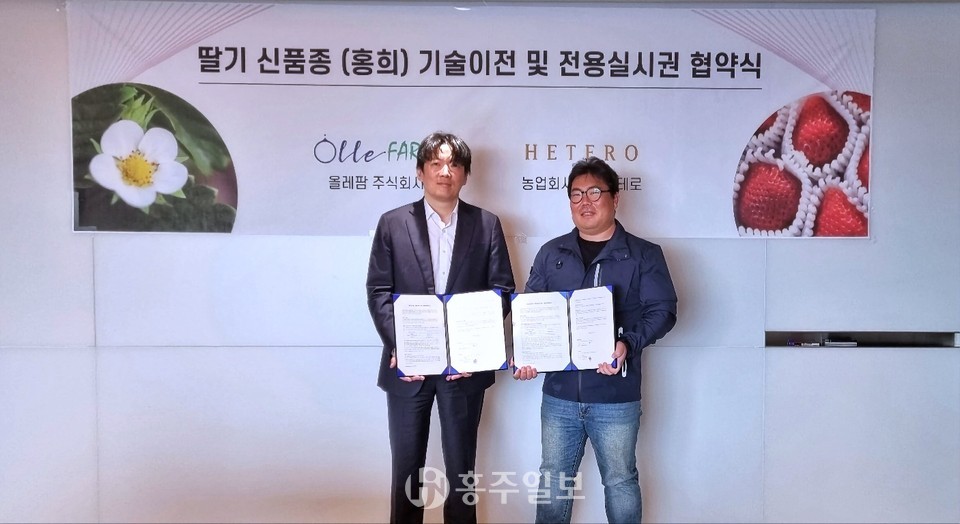 홍성군은 농업회사법인 헤테로(대표 최이영)와 스마트팜 전문기업 올레팜이 딸기 신품종 ‘홍희’ 및 그 외 품종에 대한 전용실시권 설정 계약을 체결했다고 밝혔다.