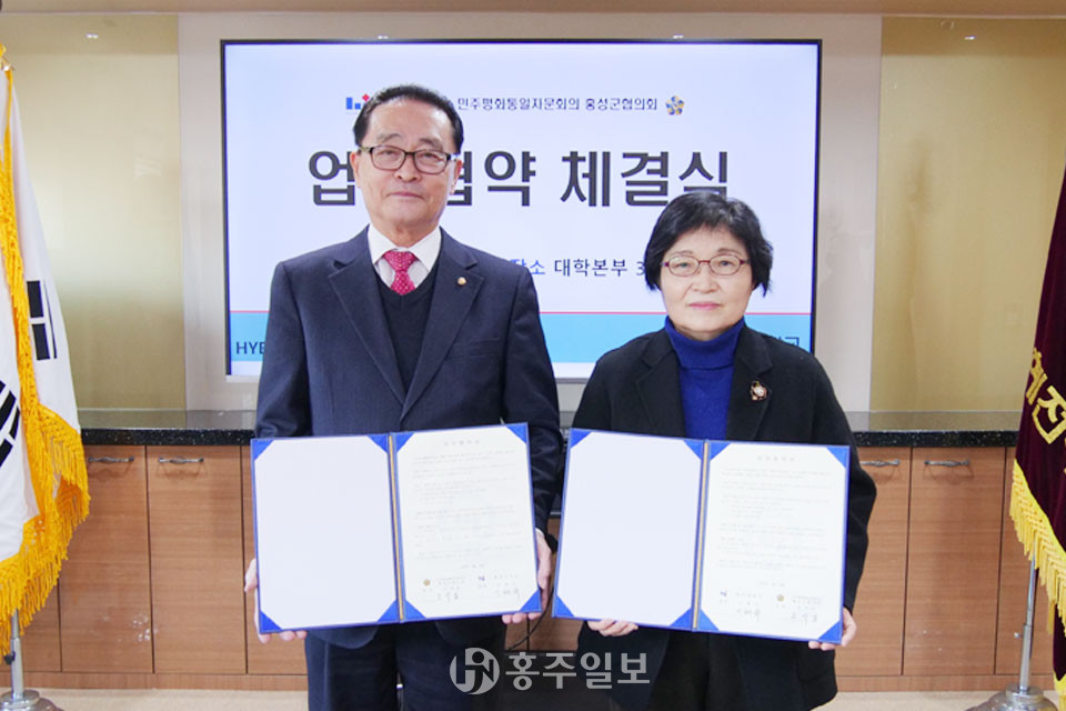 혜전대학교(총장 이혜숙)는 지난달 19일 대학 본부 회의실에서 민주평화통일자문회의 홍성군협의회(회장 오석범)와 혜전대 학생들의 평화통일 안보 교육, 각종 대회·사업에 참여, 역사 현장 교육 참여 등을 통해 평화통일에 대한 교육을 목적으로 한 업무협력 협약을 체결했다.
