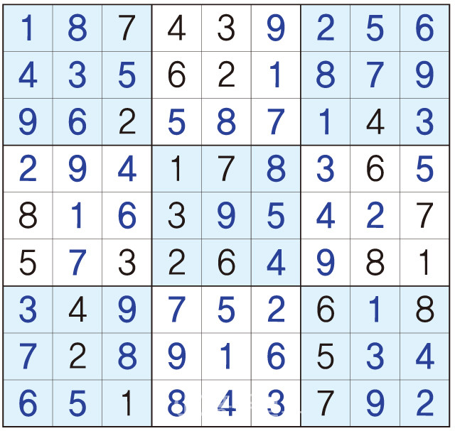 3. 큰 정사각형(9x9) 안에 있는 작은 정사각형(3x3) 안에는 숫자 1~9가 각 한 번씩 들어간다.