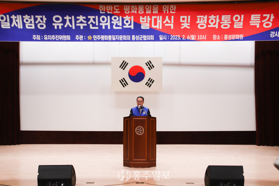 민주평화통일자문회의 홍성군협의회(회장 오석범)은 지난 6일 홍성문화원 공연장에서 ‘한반도 평화통일을 위한 충청권 통일+센터 교육체험장 유치 추진위원회 발대식 및 평화통일 특강 토론회’를 개최했다.<사진>