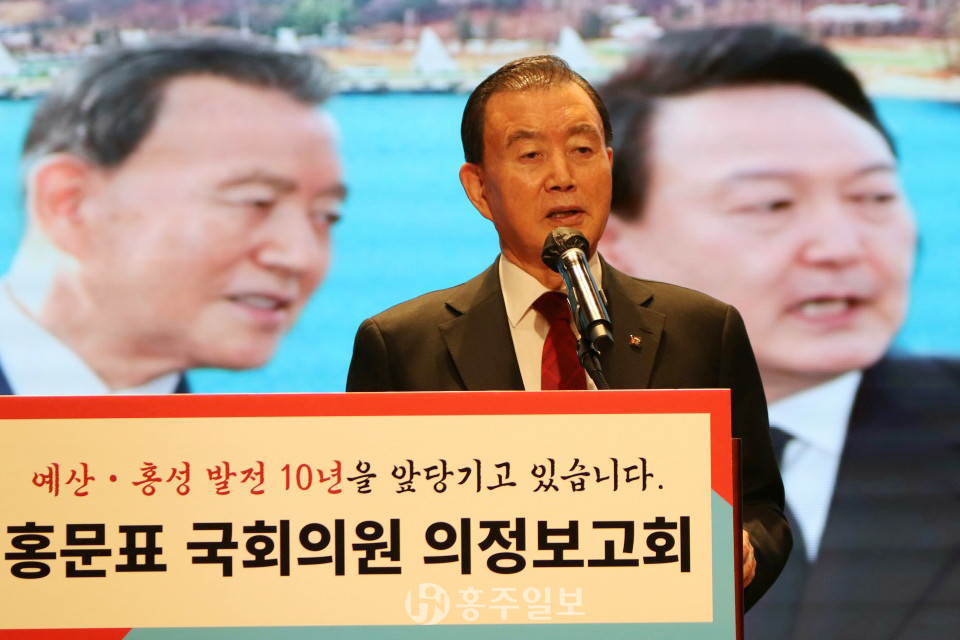 ‘예산·홍성 발전 홍문표가 10년을 앞당기고 있습니다’라는 메인 타이틀로 시작된 이번 의정보고회에는 이명수·장동혁 국회의원, 이용록 홍성군수, 최재구 예산군수, 김석환·채현병 전 홍성군수, 황선봉 전 예산군수를 비롯한 국민의힘 소속 도의원, 군의원이 참석한 가운데 열렸다.