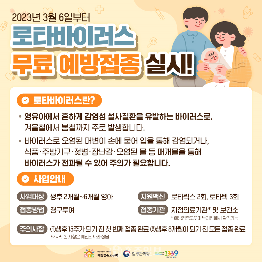 한규현 군보건소 건강증진과장은 “로타바이러스 예방접종은 생후 8개월 이내에 해야 높은 예방효과가 있어 적기에 접종하는 것이 중요하다”며 “국가예방접종사업 지원으로 적기 예방접종이 가능한 만큼 면역력 증진과 접종률 향상이 기대된다”고 밝혔다.
