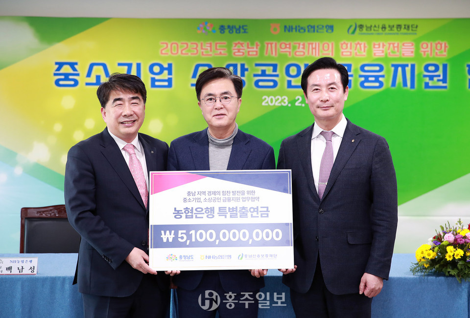 김태흠 지사는 지난 23일 도청 상황실에서 백남성 NH농협은행 충남본부장, 김두중 충남신용보증재단 이사장과 ‘중소기업·소상공인 금융 지원 확대를 위한 특별출연 업무협약’을 체결했다. 협약에 따르면, NH농협은행 충남본부는 충남신용보증재단에 51억 원을 특별출연한다.