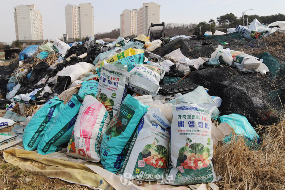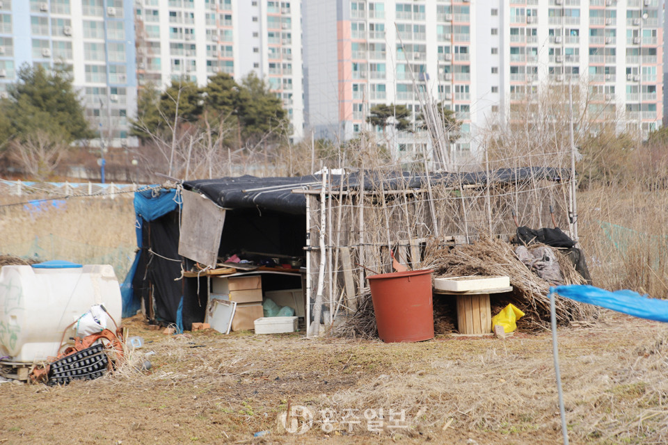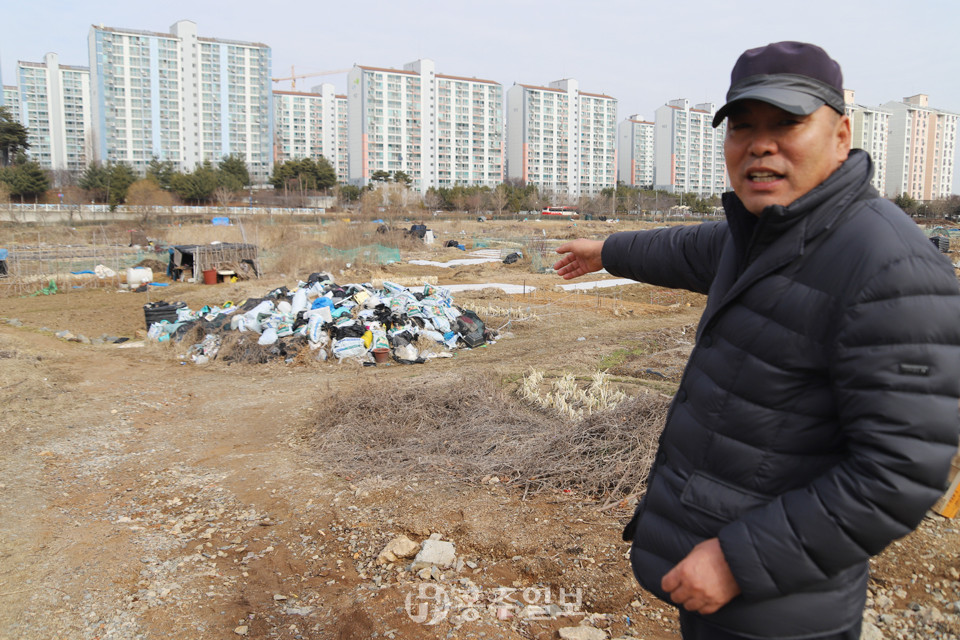 남장리 LH토지 주변은 이미 LH의 공동주택이 높게 올라있다. 하지만 LH 소유의 빈 땅은 주민들이 지었던 밭들이 여기저기 흩어져 있다. 농사를 짓는데 이용한 비료 포대 같은 것들은 그대로 남아 쓰레기로 모여 있고, 농사를 짓기 위한 농막이 2~3곳 지어져 있다. 박문길 남장2리 이장은 “불법으로 농사를 짓는 주민들은 누가 먼저 지었는지를 가지고 큰 싸움도 벌어졌다. 남에 땅 가지고 니땅내땅 주장하는 것이 흡사 난민촌 같다”고 말했다.