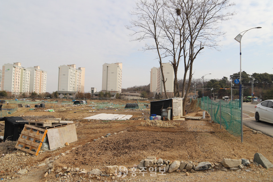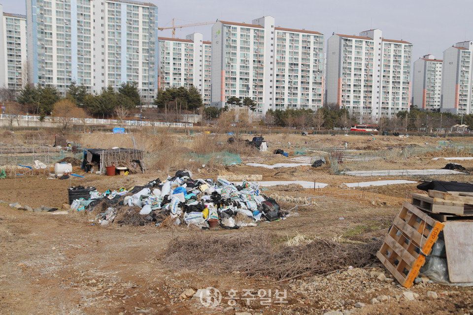 홍성군 남장2리의 ‘LH홍성남장지구’ 중 개발이 되지 않는 약 3만 2000㎡(약 1만 평) 가량의 토지는 10년 넘게 방치 중이다. 이 토지는 2007년도에 허가를 받았지만 16년이 다 되어 가도록 아직도 이곳을 개발한다는 말은 묘연하다. 긴 세월이 지나면서 주민들은 하나, 둘씩 농사를 지었고 이제는 ‘거대한 농장’ 같은 분위기를 연출하고 있다. 더욱이 각종 농사 쓰레기와 드문드문 지어져 있는 농막 등 때문에 을씨년스러운 분위기마저 연출하고 있다.