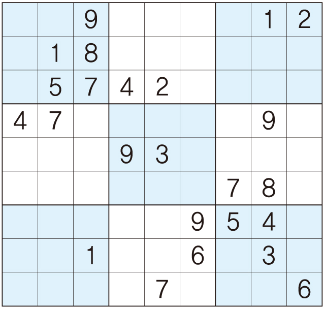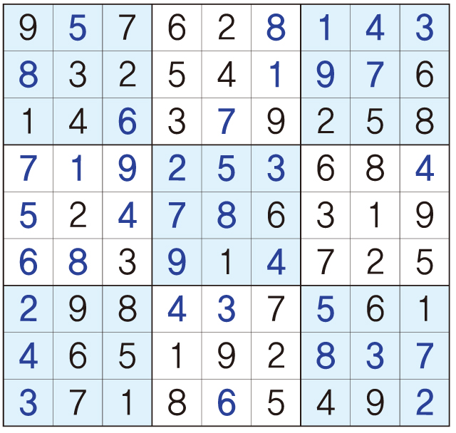 3. 큰 정사각형(9x9) 안에 있는 작은 정사각형(3x3) 안에는 숫자 1~9가 각 한 번씩 들어간다.