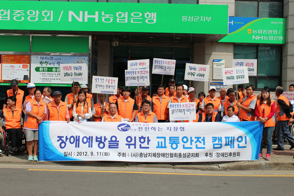 (사)충남지체장애인협회홍성군지회(지회장 복천규)는 지난 11일 홍성농협중앙회 앞 사거리에서 군 관계자와 협회 회원, 홍성군장애인후원회(회장 조원행) 등 50여명이 함께 장애예방을 위한 교통안전 캠페인 및 장애인 편의시설 촉진캠페인을 펼쳤다. 한시간 동안 진행된 캠페인은 홍성 주민들에게 안전운전과 음주운전 예방 홍보지를 직접 전달하고 동시에 피켓을 들고 캠페인을 홍보했다. 복천규 지회장은 “교통안전을 통해 장애예방을 하고, 장애인 편의시설이 더욱 확충돼서 장애인들이 생활하기가 불편한 점이 줄어들었으면 한다”고 말했다.