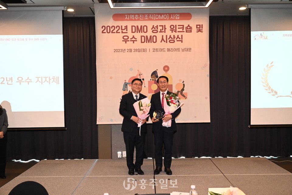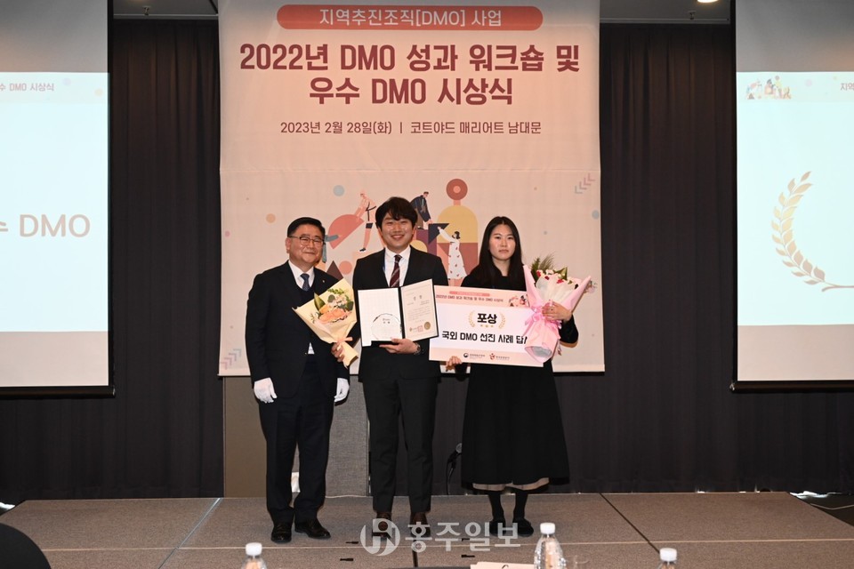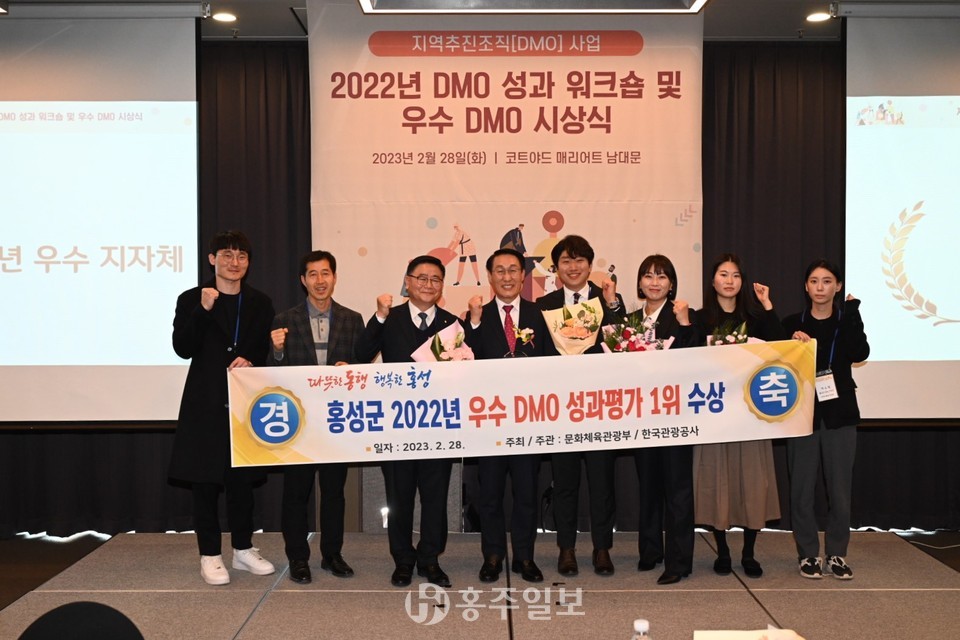 ‘2022 한국관광의 별 특별상’을 수상한 ‘홍성 DMO사업단’은 지난 28일 문화체육관광부가 주최하고 한국관광공사에서 주관한 ‘2022년 DMO 우수사업 시상식’에서 전국 총 21개 지자체 가운데 S등급 종합 1위로 선정돼 전국 유일 3년 연속 1위를 수상하는 쾌거를 이뤘고 홍성군은 감사패를 수여 받았다.