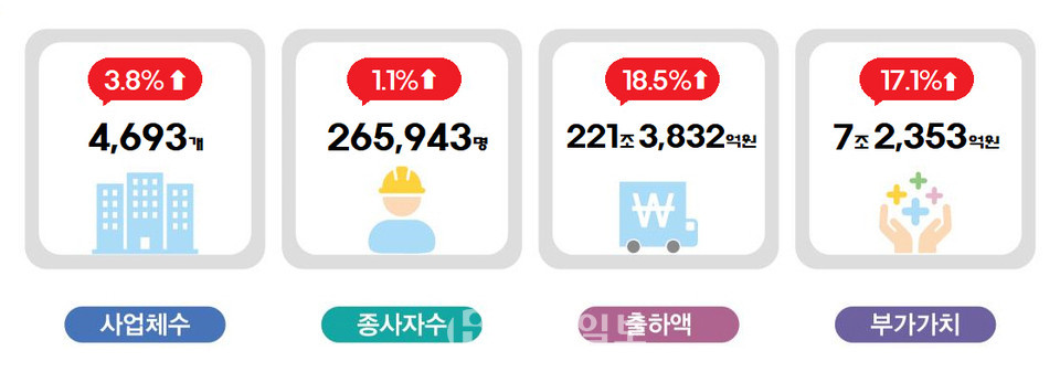 이들 사업체 수는 4693개로 2020년(4523개)에 비해서 170개(3.8%), 종사자 수는 26만 5943명으로 2020년(26만 2967명)에 비해서 2976명(1.1%) 증가했다.