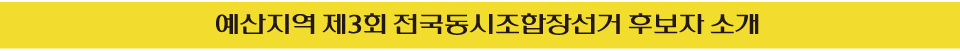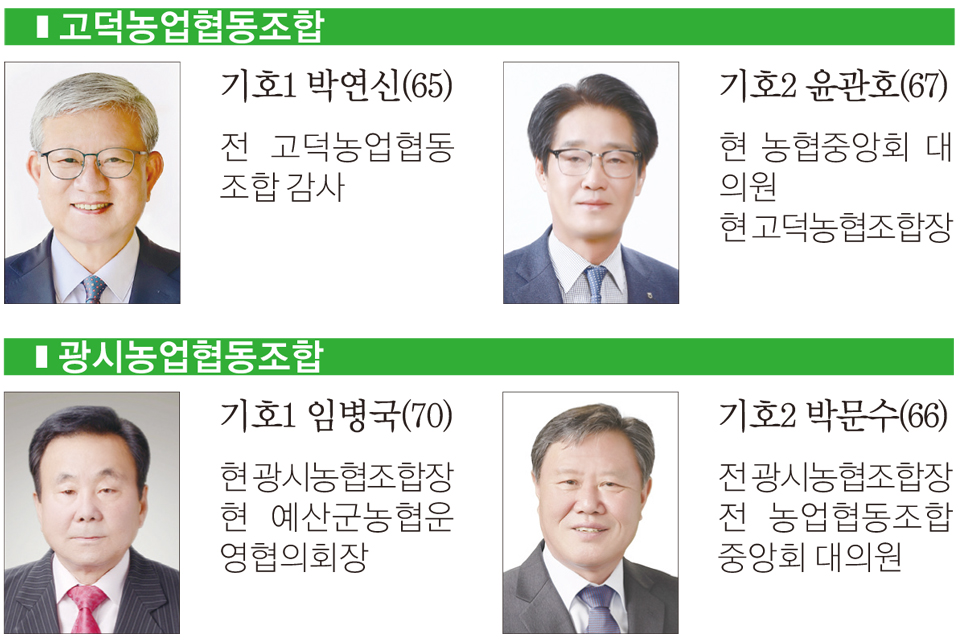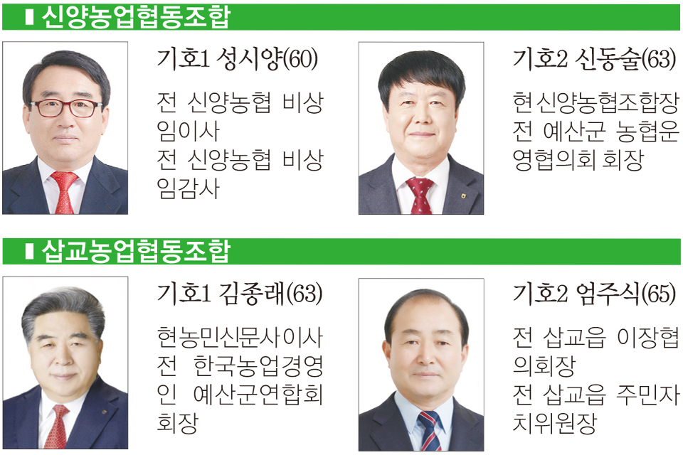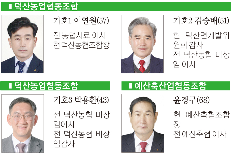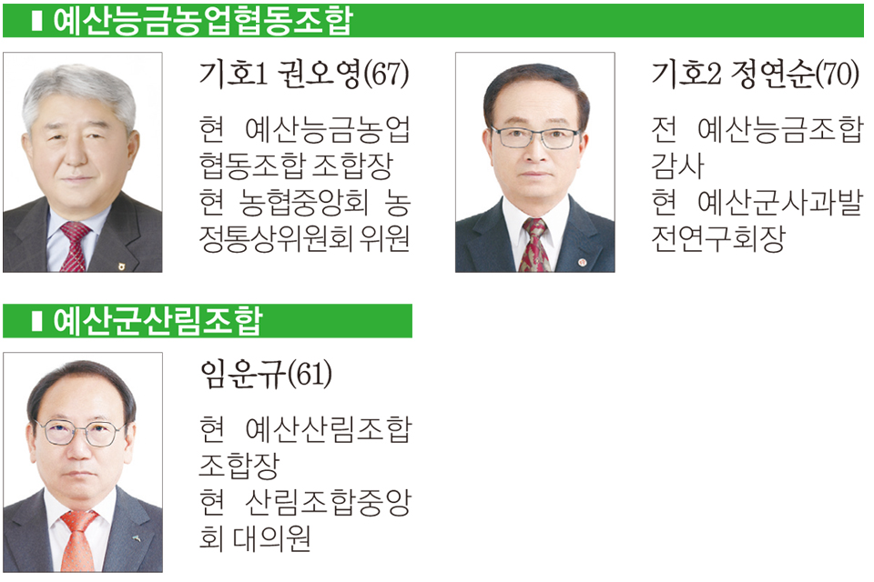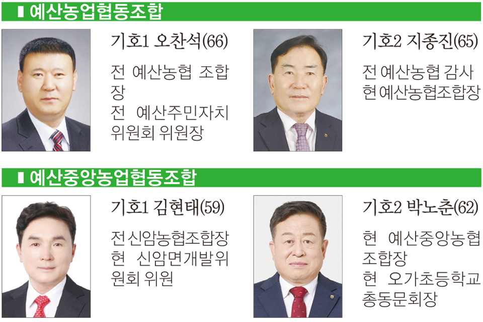 예산의 경우 총 10곳의 조합에 19명이 출마해 1.9대 1의 경쟁률을 보인 가운데 덕산농업협동조합이 3명이 출마해 가장 치열한 경쟁률을 보이고 있다. 예산지역의 다른 조합에는 각 2명씩 출마했으며, △예산축산업협동조합(윤경구) △예산군산립조합(임운규) 등이 단독후보로 출마, 재입성한다.