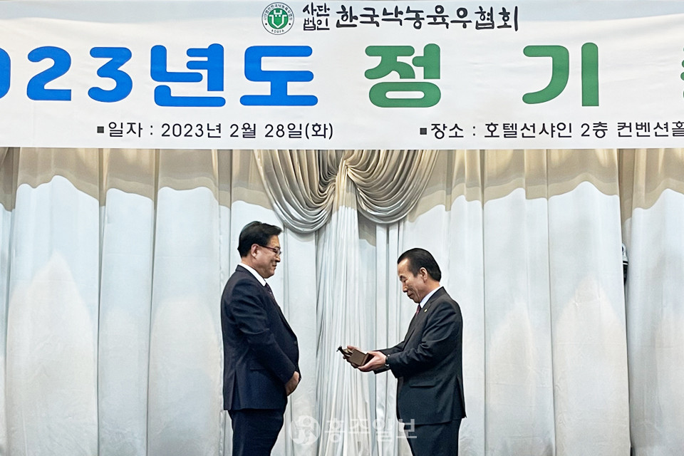 홍성낙농협동조합(조합장 최기생)는 한국낙농육우협회(회장 이승호)가 지난달 28일 호텔선샤인 2층 컨벤션홀에서 개최한 ‘2023년도 정기총회’에서 우리나라 낙농육우산업 발전에 기여한 공로를 인정받아 감사패를 수상했다.<사진>