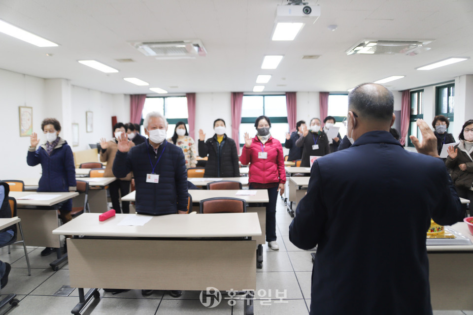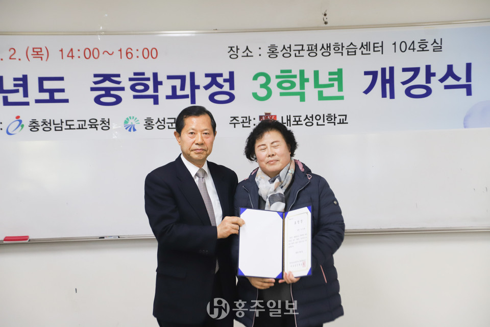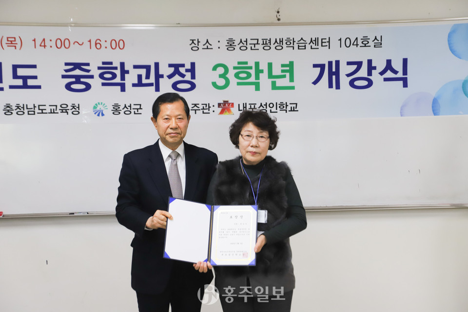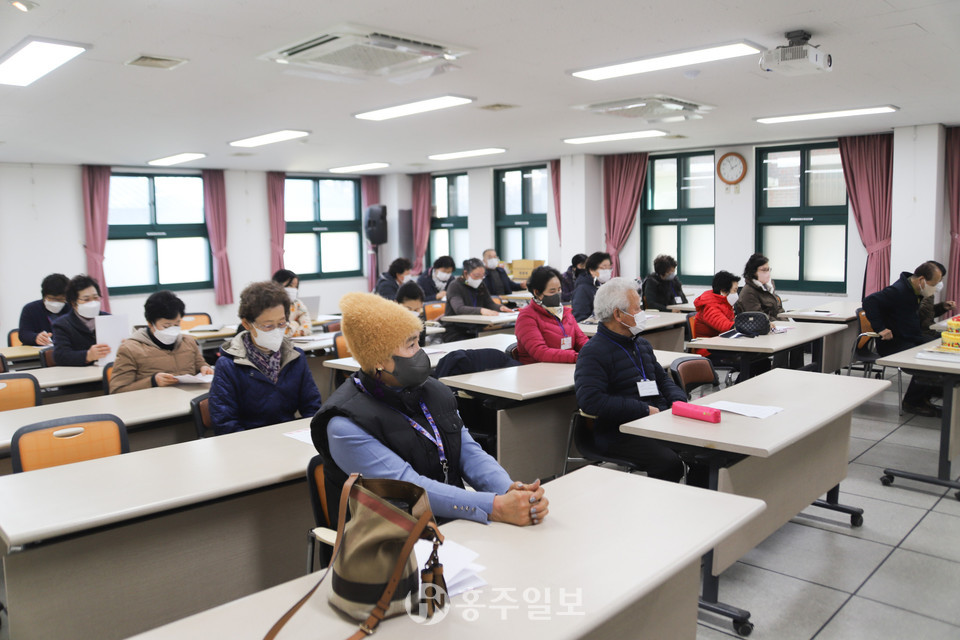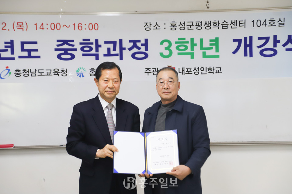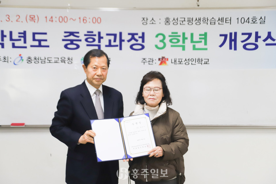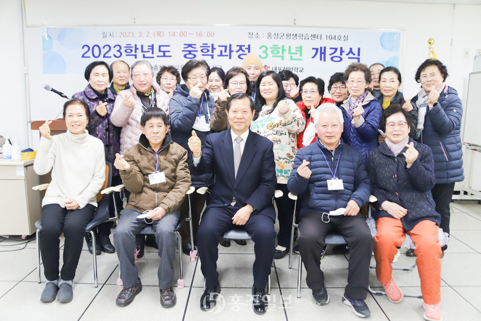 내포성인학교(교장 최광묵)의 ‘2023학년도 중학과정 3학년 개강식’이 지난 2일 오후 2시부터 홍성군평생학습센터 104호실에서 개최됐다. 내포성인학교는 제때 배우지 못한 어르신 등에게 배움을 전하는 학교로 중학 학력 인정 과정이다. 특히 이날은 3학년 과정의 수강생들의 신학기 개강식을 진행했다.