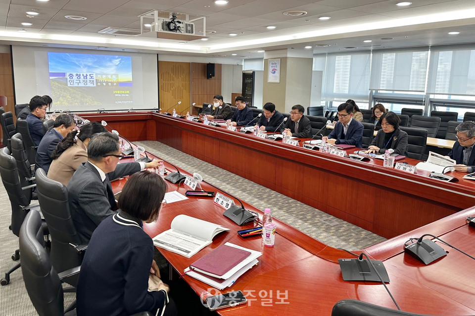 충남도는 지난 6일 도청 중회의실에서 2023~2027년 인구정책 기본계획 수립 연구용역 중간보고회를 열고, 시군별 맞춤형 인구정책 방향을 논의했다.<사진>