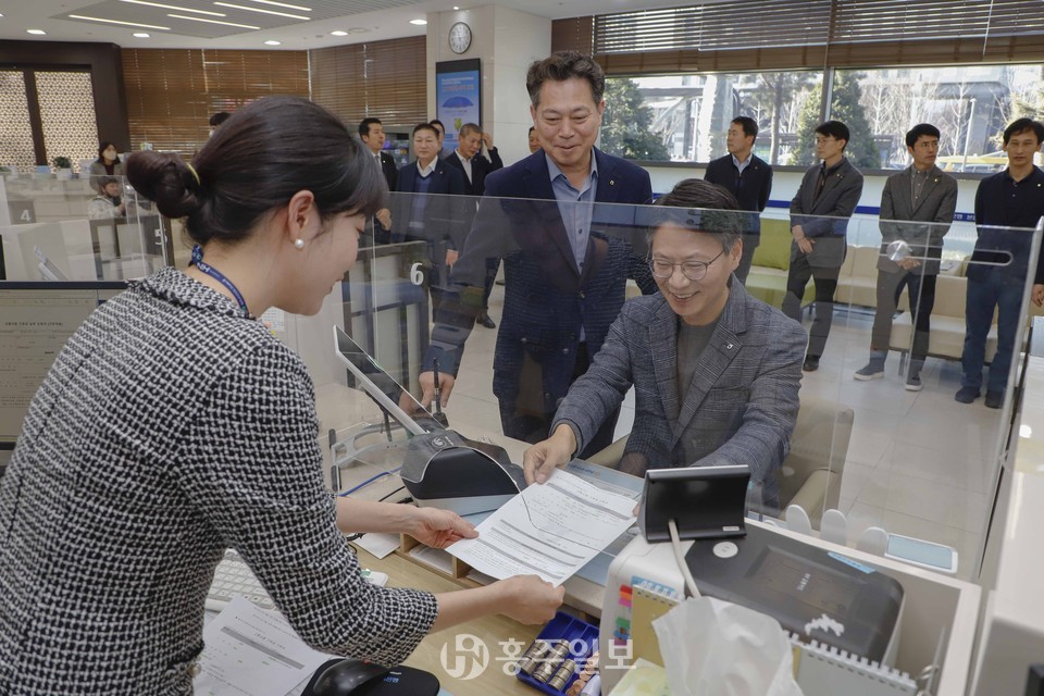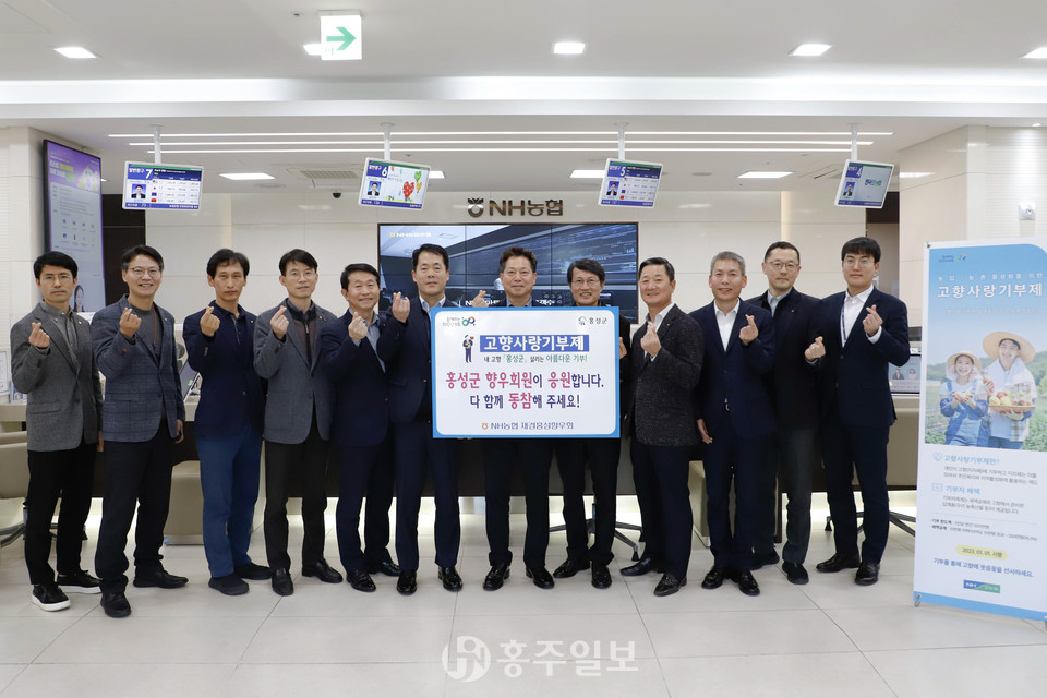 NH농협(회장 이성희) 중앙본부에 근무 중인 조소행 상호금융대표이사 등 홍성 출신 임직원 30여 명은 농협은행 본점 영업부를 찾아 고향사랑기부금을 납부하고 농·축협 고향사랑 특화 금융상품인 ‘NH고향사랑기부 예·적금’을 비대면으로 가입하며 애향심을 드러냈다.<사진>