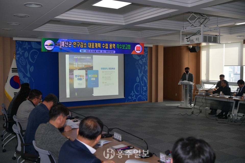 이를 위해 군은 지난 6일 군청 대회의실에서 최재구 예산군수를 비롯한 부서장과 인구감소대응위원회 위원 등이 참석한 가운데 ‘예산군 인구감소 대응계획 수립 용역 착수보고회’를 개최했다.<사진>
