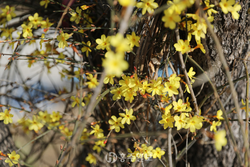 꽃샘추위가 채 가시지 않은 3월 초순, 개나리 꽃잎이 나기 보름쯤 앞서 봄을 알리는 샛노랗고 앙증맞은 소담스런 노란꽃 ‘영춘화’가 홍북읍의 한적한 길가에서 오가는 이들에게 “봄이 여기 있어요”라고 외치는 듯하다.