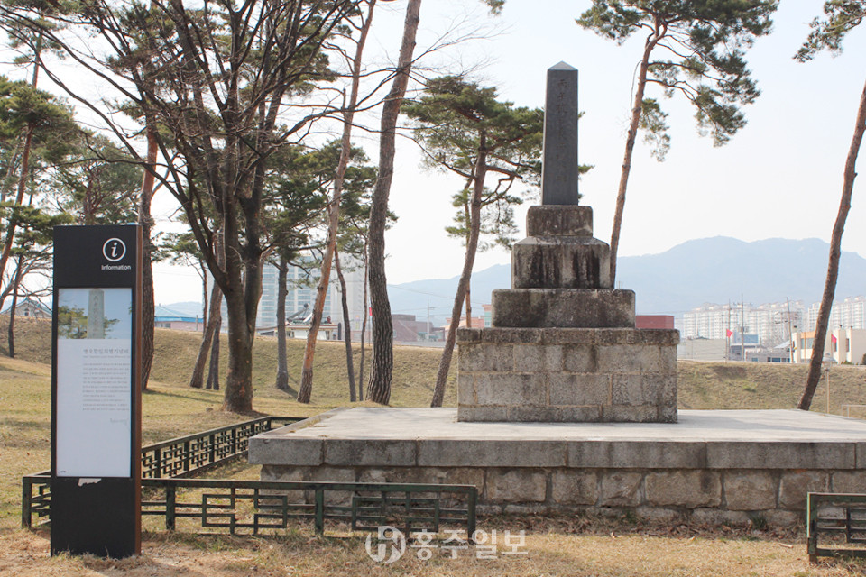 이 비가 세워지기 이전에는 1906년 5월 홍주의병에게 도살된 일본군과 그들의 앞잡이가 되었던 매국노들을 애도하기 위한 ‘애도비(哀悼碑)’가 세워져 있었다고 한다. 항일의병 당시 죽은 친일관군과 일본군을 애도하기 위해 1907년 매국노의 일원이었던 중추원 의장 김윤식(金允植)이 시를 짓고, 내각총리대신 이완용(李完用)이 글을 쓴 비석인 ‘애도비(哀悼碑)’는 36년 동안 우리 민족의 민족적 분노의 대상이었다.