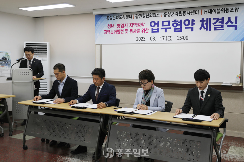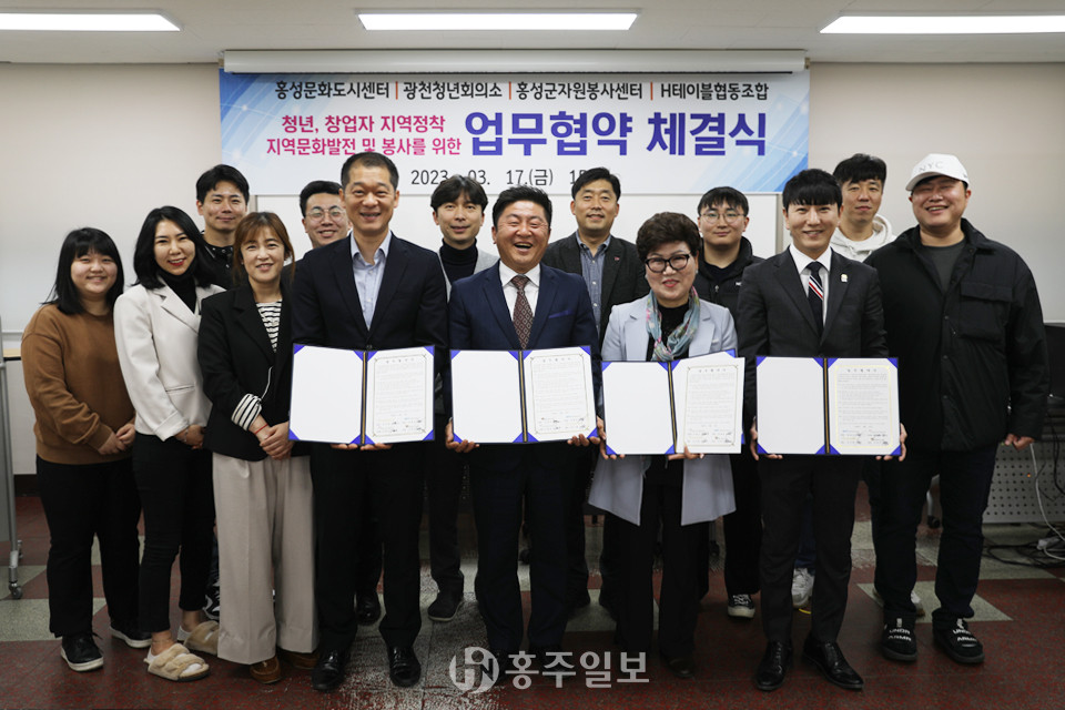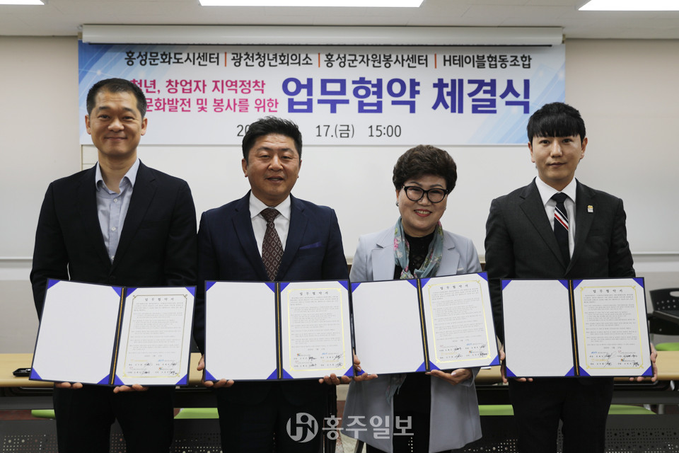 광천청년회의소(회장 천재호), (사)홍성군자원봉사센터(이사장 김해순), H테이블협동조합(대표 김두홍), 홍성문화도시센터(단장 모영선)는 17일 홍성문화특화사업단 회의실에서 청년과 창업자의 지역 정착과 따뜻한 지역사회 공동체 및 지속가능한 문화도시 조성을 위해 상호 간 협력하기 위한 업무협약(MOU)을 체결했다.<사진>