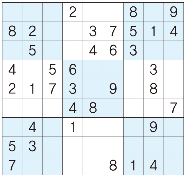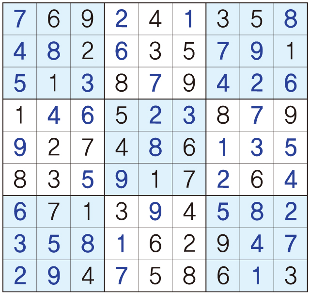 3. 큰 정사각형(9x9) 안에 있는 작은 정사각형(3x3) 안에는 숫자 1~9가 각 한 번씩 들어간다.