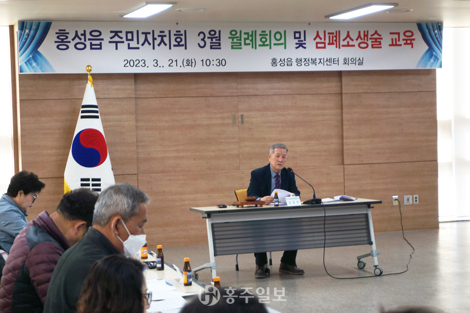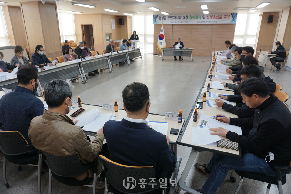 홍성읍주민자치회(회장 김종만)는 지난 21일 홍성읍행정복지센터 2층 회의실에서 위원 40여 명이 참석한 가운데 월례회의를 개최했다.<사진>