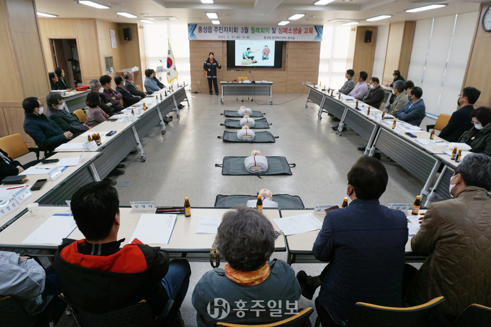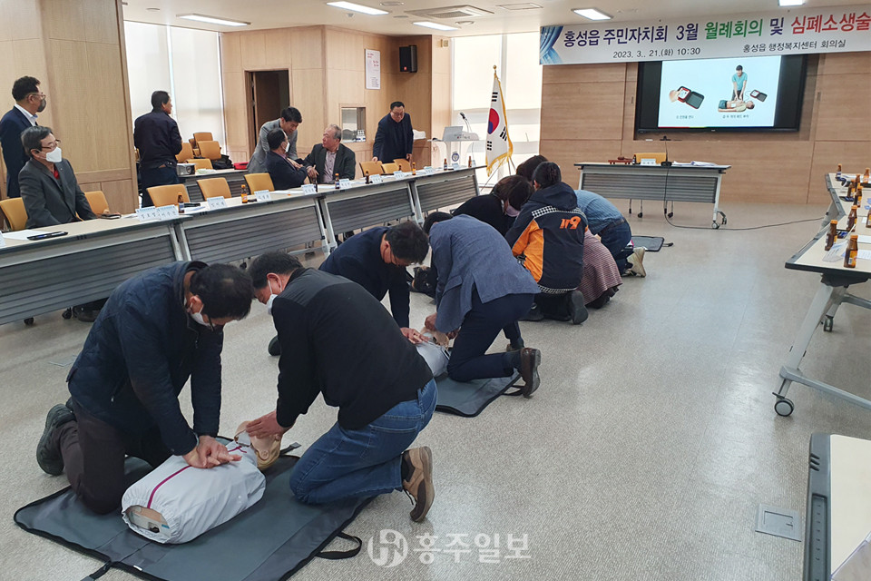 이날 월례회의에서는 주민자치 위원을 대상으로 홍성소방서 대원들의 심폐소생술 교육이 실시됐다. 위원들은 약 40분간 진행된 교육에서 이론 교육을 통해 필요성과 중요성을 인지하고 올바른 심폐소생술에 대한 실습을 이어갔다.