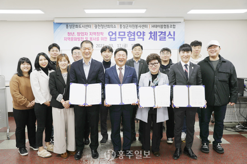 광천청년회의소(회장 천재호), (사)홍성군자원봉사센터(이사장 김해순), H테이블협동조합(대표 김두홍), 홍성문화도시센터(단장 모영선)는 지난 17일 홍성문화특화사업단 회의실에서 청년과 창업자의 지역 정착과 따뜻한 지역사회 공동체 및 지속가능한 문화도시 조성을 위해 상호 간 협력하기 위한 업무협약을 체결했다.