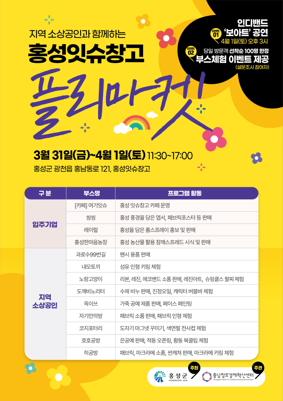 이번 플리마켓은 홍성군이 주최하고 (재)충남창조경제혁신센터가 주관하며, 잇슈창고에 입주한 청년창업기업 △여기잇슈 △레이럴 △씽씽 △홍성한마음농장을 주축으로, 홍성 지역 ‘콩콩콩예술협동조합’ 소속 업체 등 지역 소상공인 13개 업체가 참여한다.