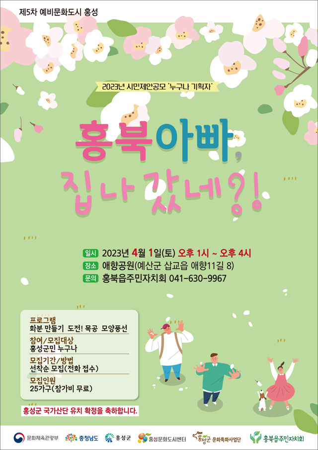 프로그램 참여 대상은 홍성군민 누구나 가능하며 행사 당일 선착순 모집이다. 참여 문의는 홍북읍주민자치회(041-630-9967)로 하면 되며, 25가정을 모집하고 참가비는 무료이다.