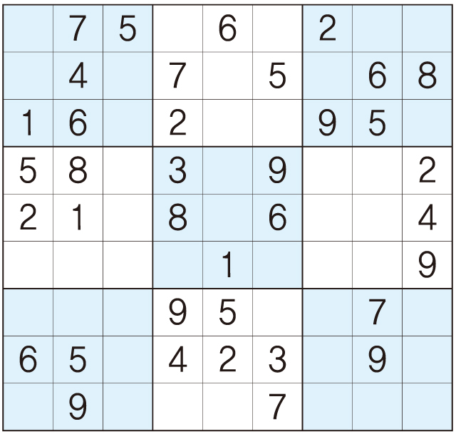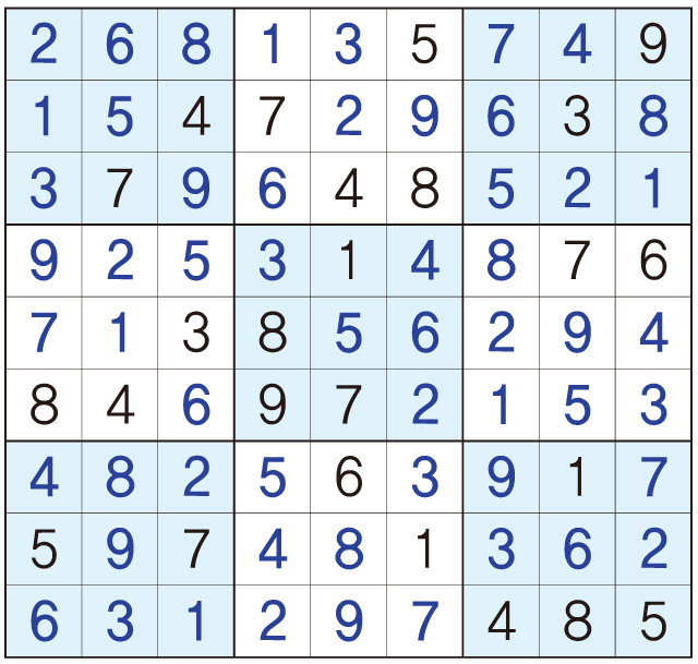 3. 큰 정사각형(9x9) 안에 있는 작은 정사각형(3x3) 안에는 숫자 1~9가 각 한 번씩 들어간다.