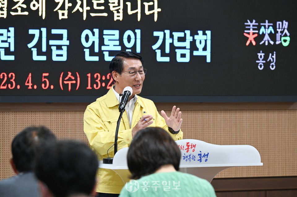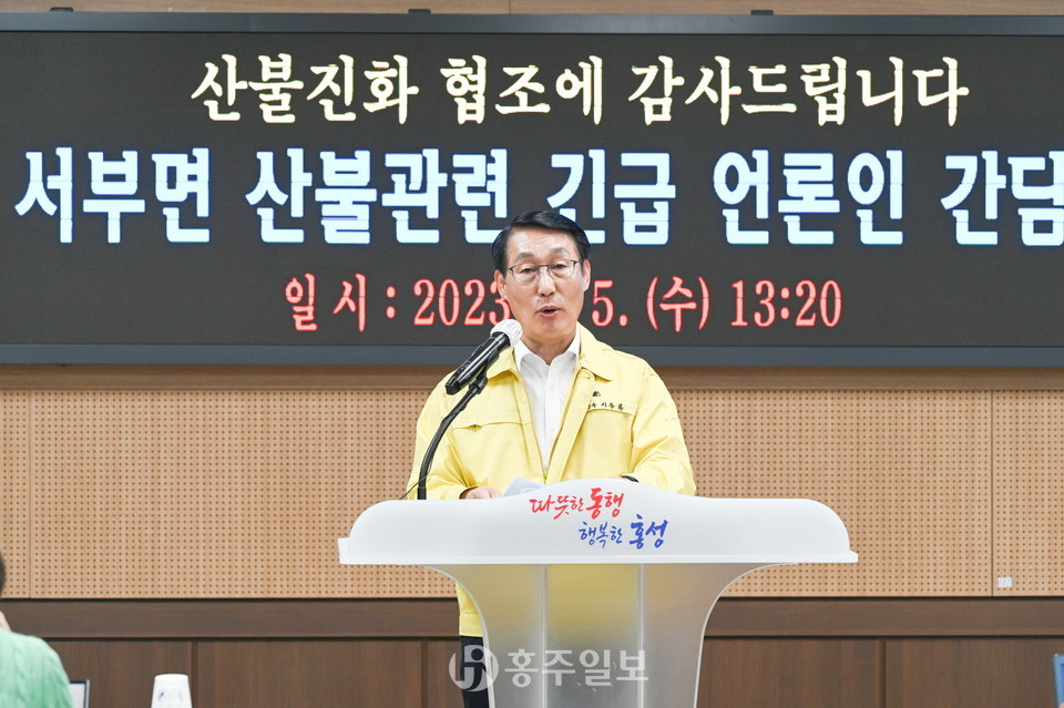 지난 5일 이용록 홍성군수는 군청 회의실에서 올해 국내 최대규모의 서부면 산불과 관련해 긴급 언론브리핑을 개최하고, 군민들을 위해 신속한 피해 상황 파악과 복구·지원에 총력을 다하겠다고 밝혔다.