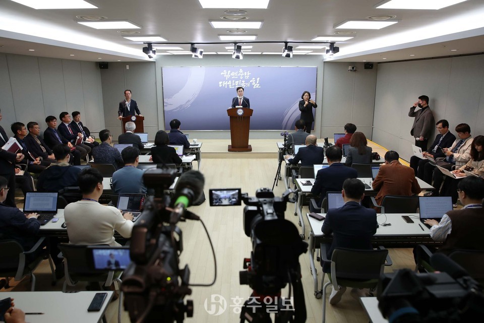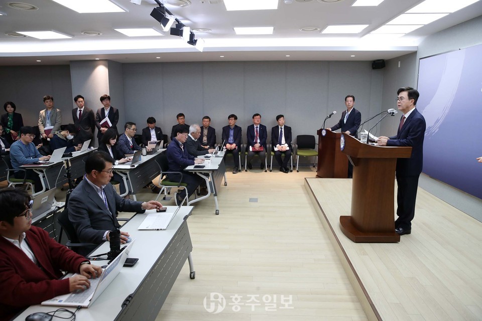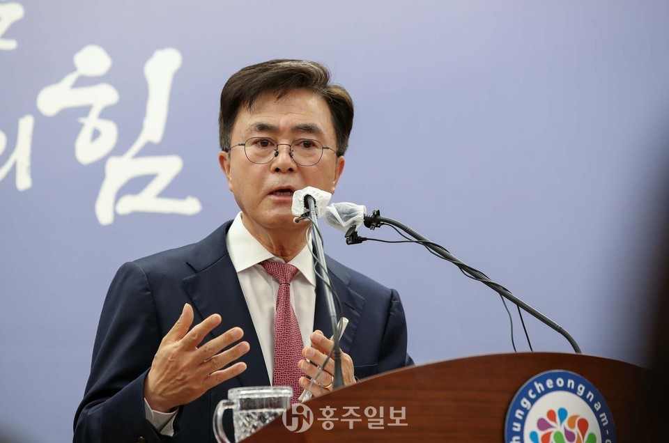 김 지사는 5일 도청 프레스센터에서 기자회견을 열고, 산불 피해지 특별재난지역 선포와 4일 삼성디스플레이 아산캠퍼스에서 열린 ‘삼성디스플레이 신규투자 협약식’ 관련 성과 등을 설명했다.