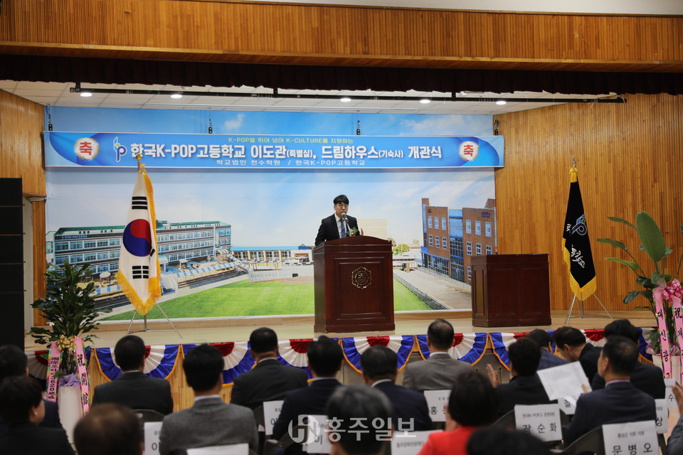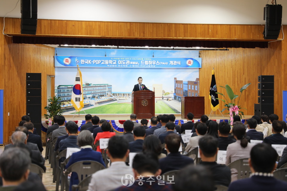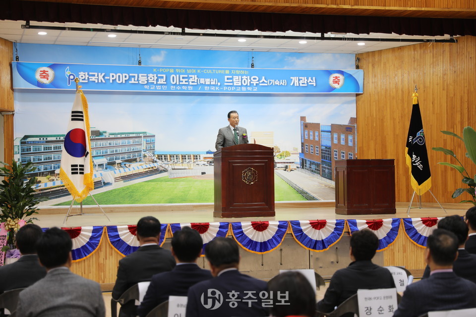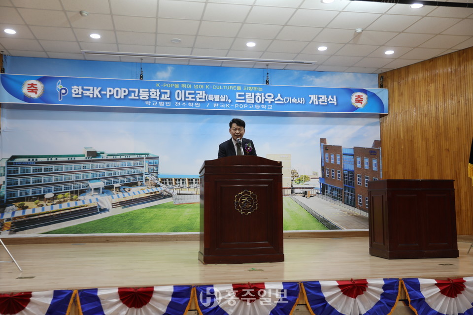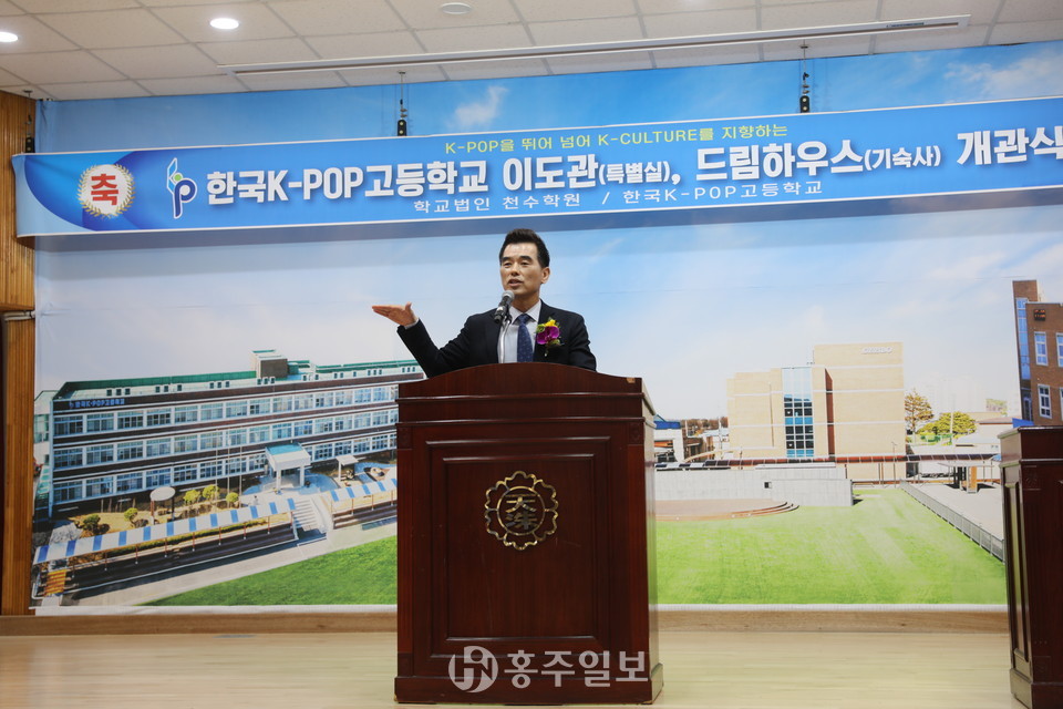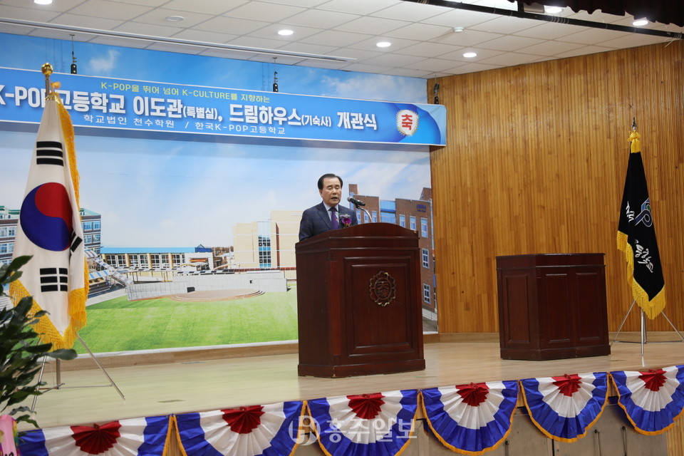 학교법인 천수학원(이사장 박천수) 한국K-POP고등학교(교장 박병규)는 지난 7일 재학생 60여 명과 학교 관계자 및 내·외빈 등 200여 명이 참석한 가운데 ‘이도관(특별실)·드림하우스(기숙사) 개관식’을 개최했다.