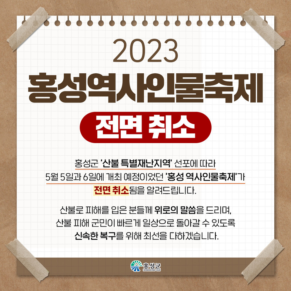 홍성군이 오는 5월 5일부터 6일까지 2일간 개최 예정이었던 ‘어린이큰잔치와 함께하는 2023 홍성역사인물축제’를 전면 취소한다고 밝혔다.