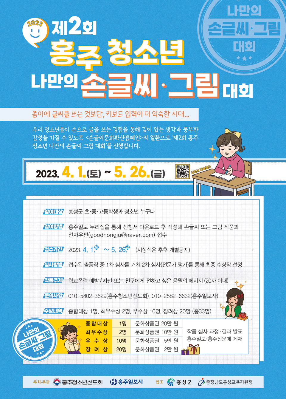 참여방법은 홍주일보 누리집(www.hjn24.com)에 접속해 메인페이지 ‘제2회 홍주 청소년 나만의 손글씨·그림 대회’ 팝업창을 통해 공지사항 게시물에 첨부된 신청서를 다운로드 받아 작성한 후, 출품작과 함께 전자우편(goodhongju@naver.com)으로 접수하면 된다.