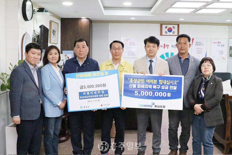 더불어민주당 홍성예산지역위원회(위원장 오배근)는 지난 10일 복기왕 충남도당위원장을 비롯해 당원 30여 명과 함께 홍성 산불피해 현장을 방문해 피해지역 주민들을 위로하고, 충남도당 500만 원, 홍성예산지역위원회 300만 원 등 성금을 전달했다.