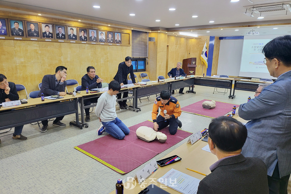 홍성소방서발전위원회(위원장 차대식)는 지난 10일 정기회의에 앞서 발전위원회 위원 25명을 대상으로 응급상황 발생 시 신속하고 적절한 대처를 위한 심폐소생술, 자동심장충격기(AED) 사용법, 하임리히 응급처치법 등 실습위주의 심폐소생술 집중 교육을 실시했다.