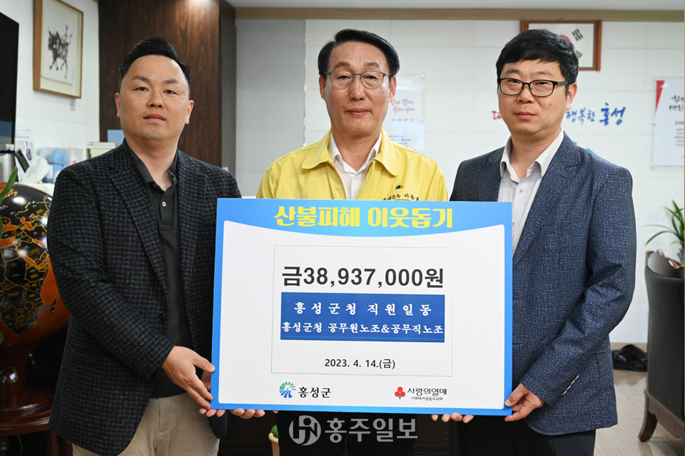 이용록 홍성군수는 “뜻하지 않은 산불로 어려움을 겪고 있는 이재민과 피해 주민의 아픔을 위로하고자 군 직원들이 자발적으로 십시일반 모은 성금이다. 아픔을 겪는 군민들에게 조금이나마 도움이 되길 바란다”며 “군은 신속한 피해복구를 위해 최선을 다하겠다. 실의에 빠진 우리의 이웃이 이 위기를 이겨낼 수 있도록 국민 여러분의 많은 관심과 응원 부탁드린다”고 전했다.
