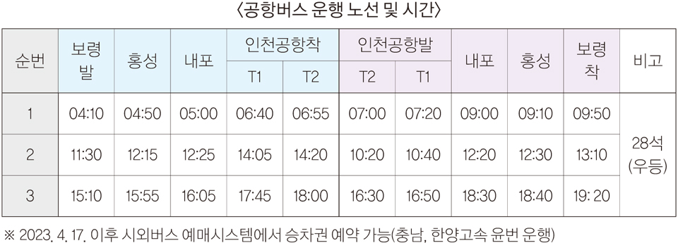 운행 시간은 각각 보령발의 경우 △오전 4시 10분 △오전 11시 30분 △오후 3시 10분이며, 인천공항발은 △오전 7시 △오전 10시 20분 △오후 4시 30분이며, 버스 수요 상황에 따라 운행 노선과 시간을 점차 늘릴 예정이다.