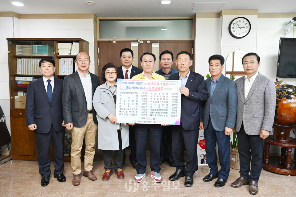 갈산면기관단체가 지난 17일 홍성군청을 방문해 산불피해성금 750만 원과 홍성사랑장학금 700만 원을 전달했다.<사진> 이날 기탁식은 (재)홍성사랑장학회 이용록 이사장과 홍성군의회 이선균 의장, 갈산면장, 갈산면기관단체장 등이 참석한 가운데 군수실에서 진행됐다.
