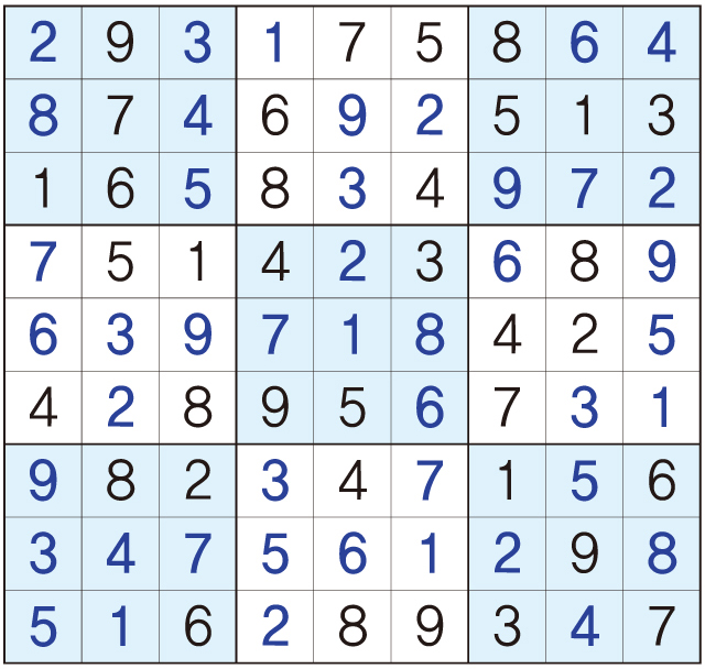 3. 큰 정사각형(9x9) 안에 있는 작은 정사각형(3x3) 안에는 숫자 1~9가 각 한 번씩 들어간다.