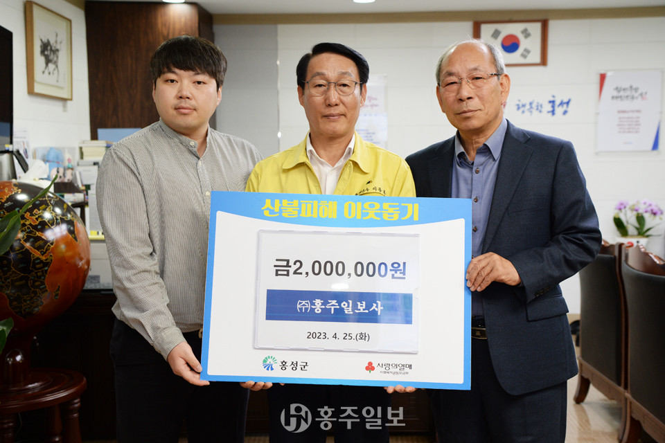 충남도청소재지 희망언론 독립신문을 표방하는 ㈜홍주일보사·홍주신문(대표이사·발행인 한관우)이 지난 25일 홍성군청 군수실을 방문해 이용록 군수에게 홍성 산불로 인한 피해 복구 성금 200만 원을 전달하며 성금 모금에 동참했다.<사진>